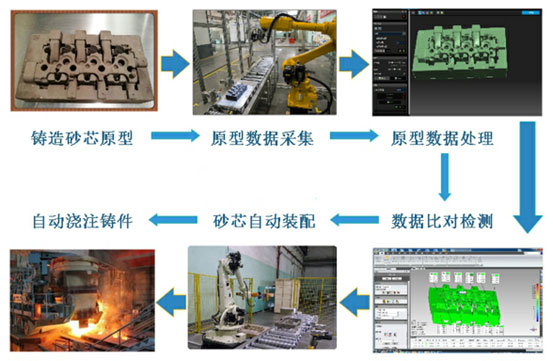 产品质量检测是企业生产现场在线工作模式,是一个生产线的工位,对测量设备精度和功能的要求远超过反求设计。因此,该检测系统可无缝应用于产品质量在线检测,如铸造、锻压及注塑等生产线上的铸件、锻件、冲压件、注塑件等复杂曲面产品检测,“一键式”全自动完成扫描检测流程,保证最佳的测量精度和速度,实现质量控制(QC)与部件生产环节紧密结合。主要技术包括: