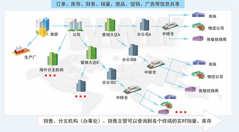 分销管理信息系统针对大中型企业分销业务管理特点,全面支持订单、库存、配送、财务、营销活动、市场活动、价格管理等企业分销业务职能,实现包含总公司、营销大区、分公司、办事处、供应商、经销商、分销商、连锁店/专卖店/专柜等企业多个经济单元组织的多层次分级集中管理。具备电子商务功能,支持网上订单处理,弹性的行业自定义功能,具有良好的可扩展能力。